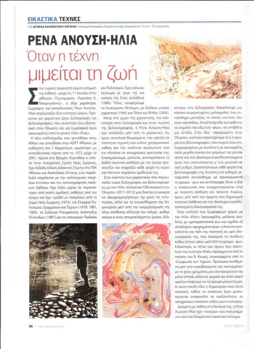 Τεράστια επιτυχία σημείωσε η πρόσφατη έκθεση έργων χαρακτικής με θέμα "Εικαστικό οδοιπορικό στον Όλυμπο" και ζωγραφικής με θέμα "Ροές" που παρουσίασε η εικαστικός Ρένα Ανούση στον Τεχνοχώρο art gallery στου Μακρυγιάννη από τις 11 Μαΐου μέχρι τις 9 Ιουνίου 2012. Η Ρένα Ανούση υπήρξε καθηγήτρια καλλιτεχνικών στην Ευαγγελική Σχολή για 30 χρόνια (1971-2001) και αποτελεί το συνδετικό κρίκο μεταξύ πολλών γενιών αποφοίτων της Σχολής. Η επίσκεψη αποφοίτων της Ευαγγελικής σε όλη τη διάρκεια της έκθεσης ήταν μαζική και ενθουσιώδης ξεπερνώντας κάθε προηγούμενο. Συγχαίρουμε την κυρία Ανούση και της ευχόμαστε ολόψυχα να ζήσει και να δημιουργεί για πολλά χρόνια ακόμη.